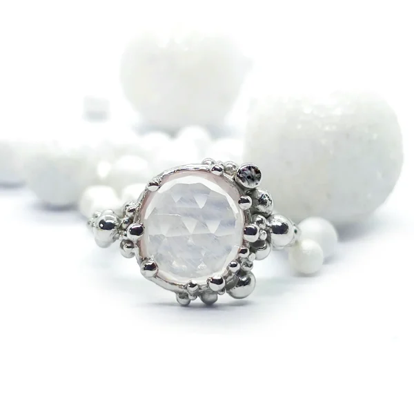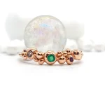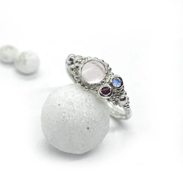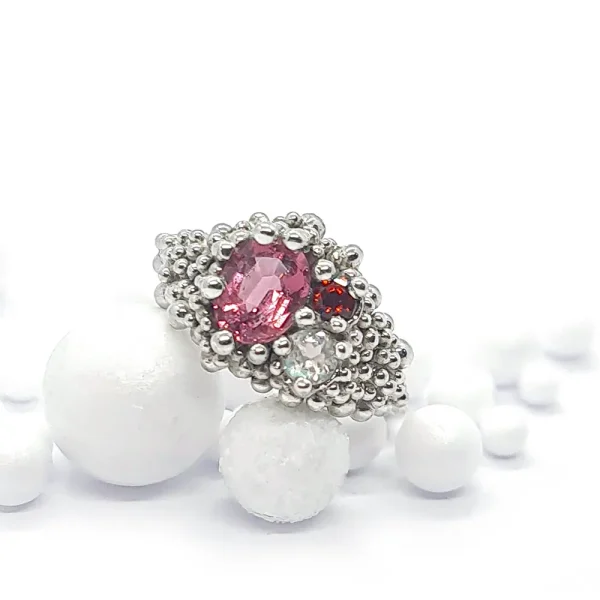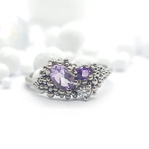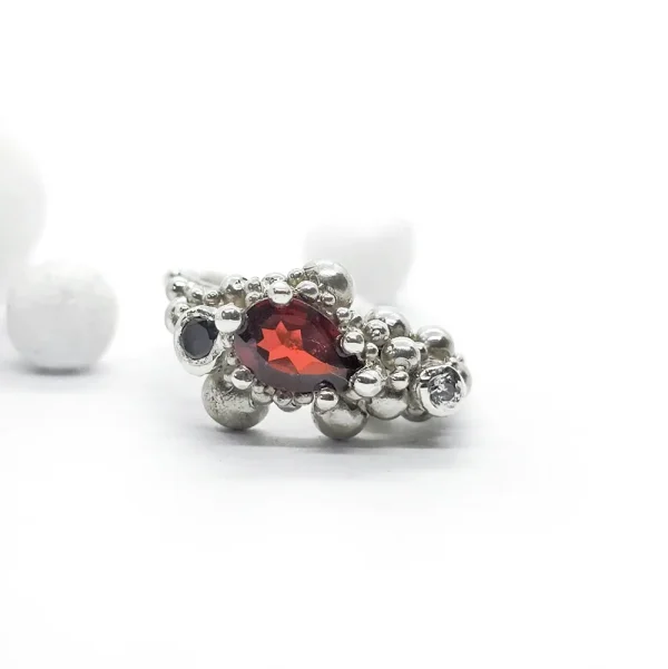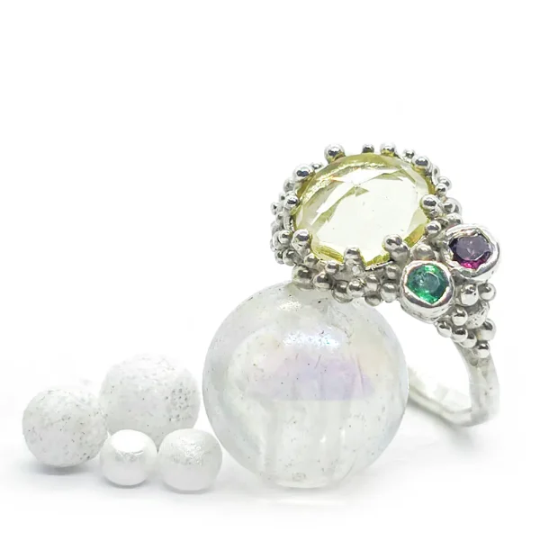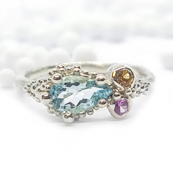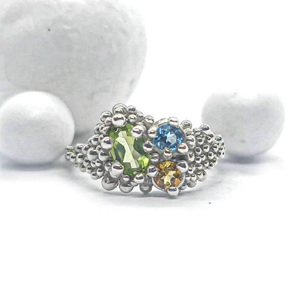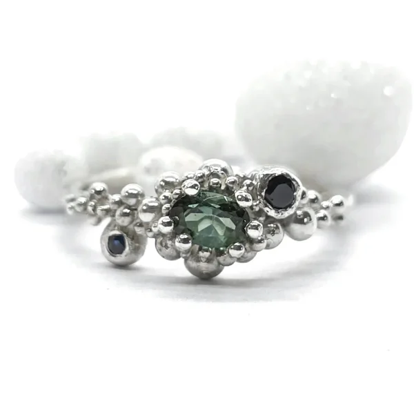 Bubbly Trio Silver je eden izmed najbolj prepoznavnih kosov Alja Kump Jewellery, ki smo ga skozi čas ustvarjali v različnih oblikah in barvnih kombinacijah. Vsak prstan nosi svojo zgodbo, ujeto v edinstveno igro bubblijev, med katerimi se svetlikajo trije kristali – en večji, ki ga izberete med različnimi oblikami, in dva manjša, ki skupaj ustvarijo čudovito celoto. Lahko je igriv, simetričen ali asimetričen – v dizajnih The Original, Sparkle, Oval, Bloom, Noir… ali v kakšnem čisto po vaši želji.